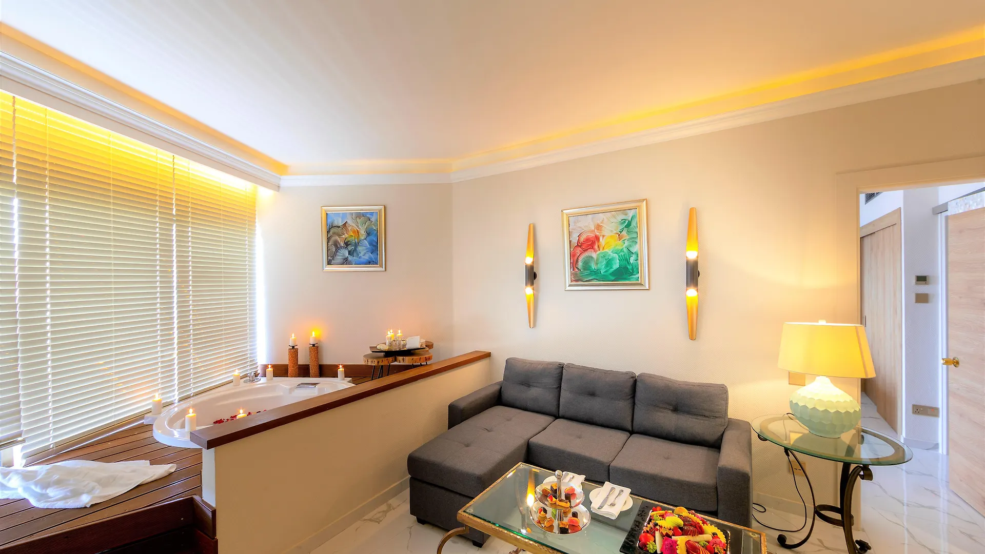 De kamers kijken uit over de Middellandse Zee en beschikken over een kluis, een balkon en een bankstel. Extra's zijn onder andere een inloopdouche en een apart toilet in de badkamers.